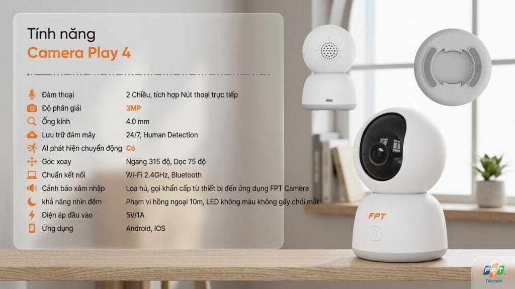 FPT Camera Play 4 được trang bị ống kính 4mm với độ phân giải 3MP, mang đến khả năng ghi hình siêu sắc nét, ngay cả trong điều kiện ánh sáng yếu.